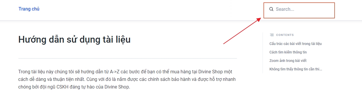 Các bài viết hướng dẫn trong tài liệu được viết chi tiết cho tất cả các phần trong Divineshop.vn. Vì vậy bạn có thể tìm kiếm các thông tin mình cần bằng hộp "Search" trong trang